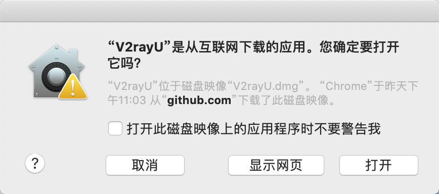 在应用程序中找到“V2rayU”, 点击打开,出现下图