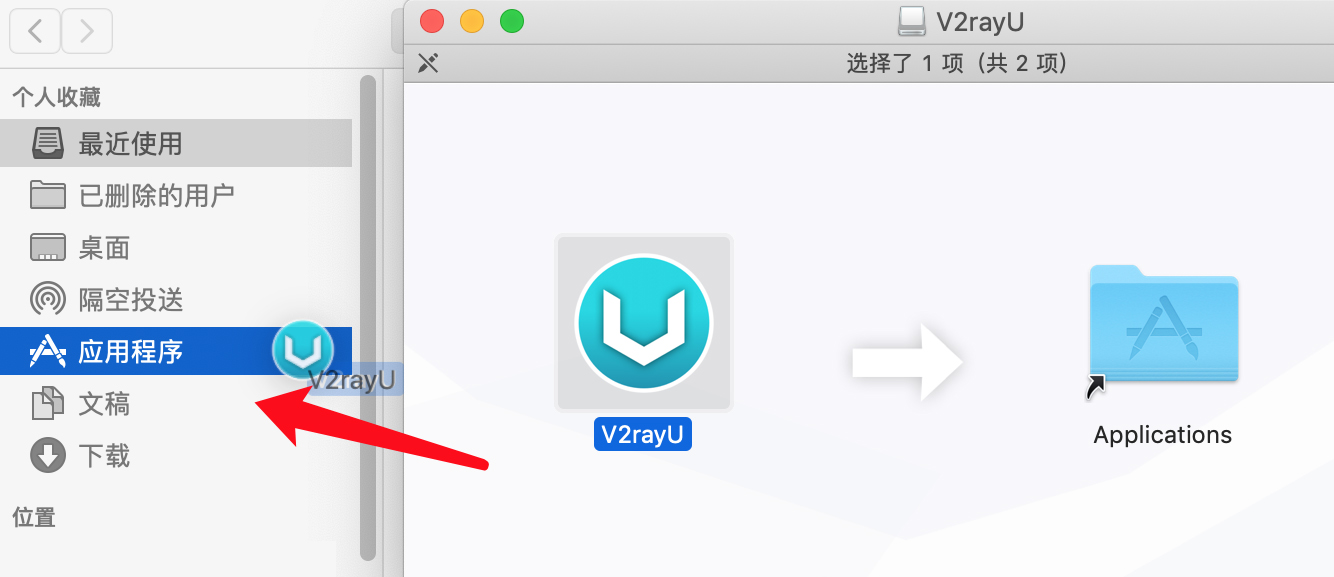 然后将“ V2rayU”图标拖拽至右侧应用程序。