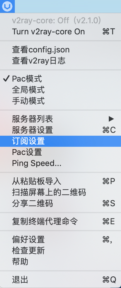 解锁完成后,Mac顶部菜单栏将出现V2rayU小图标 点击V2rayU图标,选择订阅设置